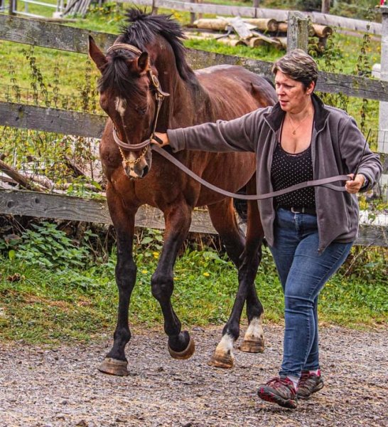 Céline Fériaque Boudaud, l'étlonnière de Freeleau, en compagnie de ce dernier, au Haras de Margnat, en Corrèze