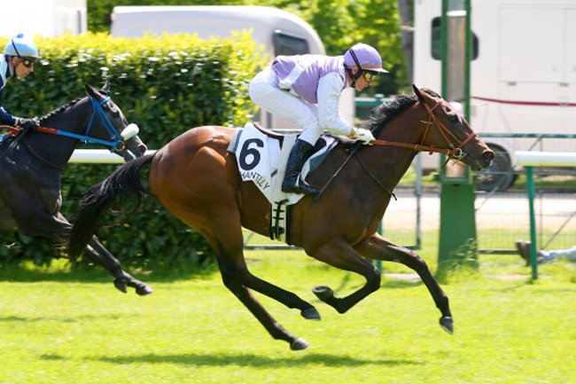 Pierre Précieuse (S. Maillot) remporte une course F à 2 ans à Chantilly et offre sa 1e victoire à son père Vertigineux. Cette élève du Haras d'Ayguemorte a été dénichée pour seulement 3.000 € sur le ring d'Osarus au Lion d'Angers. (PHOTO APRH)