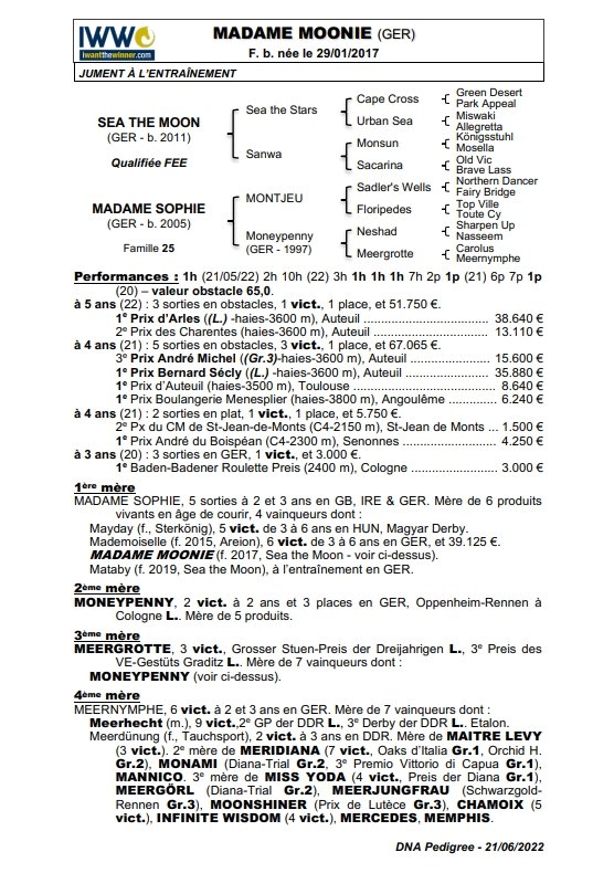 6 vict. et 132.235 €, Prix d'Arles, Auteuil (L.) (22), Prix Bernard Secly, Auteuil (L.) (21), 3e Prix Andre Michel (Gr.3) (21). Soeur de Mademoiselle. Petite-fille de MONEYPENNY (L.).