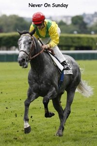 Parti à l'entraînement chez Jean-Claude Rouget, Never On Sunday a remporté le Prix du Prince d'Orange (Gr.3) à 3 ans, puis a atteint le sommet lors de sa victoire dans le Prix d'Ispahan (Gr.1) à 4 ans au printemps 2009.