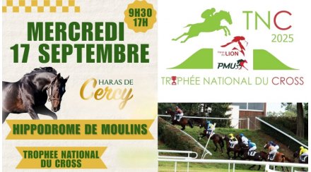 Support de la 12e étape du Trophée National du Cross - Haras du Lion - PMU, le Grand Cross de Moulins s'annonce on ne peut plus palpitant à vivre ce mercredi 17 septembre, dans l'Allier, avec la présence de plusieurs cadors de la discipline comme Hourvari Boum et Ivresse d'Estruval, mais aussi de jeunes loups aux dents longues comme Jibe des Dunes. Sitôt après ce Grand Cross, dans une journée marquée du sceau des étalons du Haras de Cercy, place sera faite à l'AQPS Store Show du Centre-Est, une présentation "montée" de pouliches et poulains de 2 ans à vocation obstacle, organisée par Galop Allier. Par Juliano Denion.